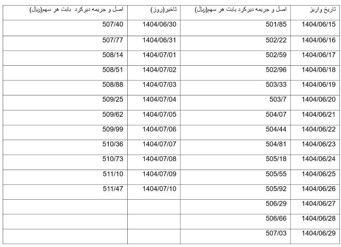 \r\n\r\n\r\nبدینوسیله به استحضار سهامداران محترم شرکت بیمه اتکایی رایا می رساند در اجرای مفاد ماده (5) اساسنامه شرکت در خصوص تادیه مبلغ باقیمانده هر سهم از سرمایه ثبت شده و به موجب مصوبه مورخ 1404.04.31 هیئت مدیره شرکت، مطابق اطلاعیه مندرج در سامانه کدال و روزنامه دنیای اقتصاد مورخ 1404.05.08 مقرر گردید مبلغ 500 ریال به ازای هر سهم از سهامداران محترم مطالبه گردد. لذا سهامدارانی که تا تاریخ 1404.06.10 موفق به پرداخت مبلغ باقیمانده سهام خود نشده اند مطابق با اطلاعیه مندرج در سامانه کدال و آگهی درج شده در روزنامه دنیای اقتصاد در تاریخ 1404.05.22، مطابق با مفاد مواد 35 تا 38 لایحه اصلاحی قسمتی از قانون تجارت، می بایستی بر اساس تاریخ روز پرداخت نسبت به تادیه وجه مورد نظر (500 ریال به ازای هر سهم) به علاوه خسارت دیرکرد از قرار نرخ رسمی بهره اعلامی شورای پول و اعتبار بعلاوه 4 درصد در سال (طبق محاسبات مندرج در جدول زیر که به ازای هر سهم و هر روز تاخیر انجام شده است) حداکثر یک ماه پس از تاریخ تعیین شده به شرح فوق (تا تاریخ 1404.07.10) به شماره حساب: 127996719271531 (شماره شبا: IR210640012799671927153001) نزد بانک گردشگری شعبه شریعتی کد 127 به نام شرکت بیمه اتکایی رایا (سهامی عام) اقدام نمایند؛ و رسید واریز وجه به همراه مشخصات کامل سهامداران و اطلاعات تماس ظرف مهلت مقرر به دفتر مرکزی شرکت واقع در تهران، خیابان دیباجی جنوبی، نبش خیابان برادران جوزی، پلاک 132، ساختمان رایا طبقه دوم یا به پست الکترونیک شرکت به نشانی Info@Rayare.ir ارسال نمایند.