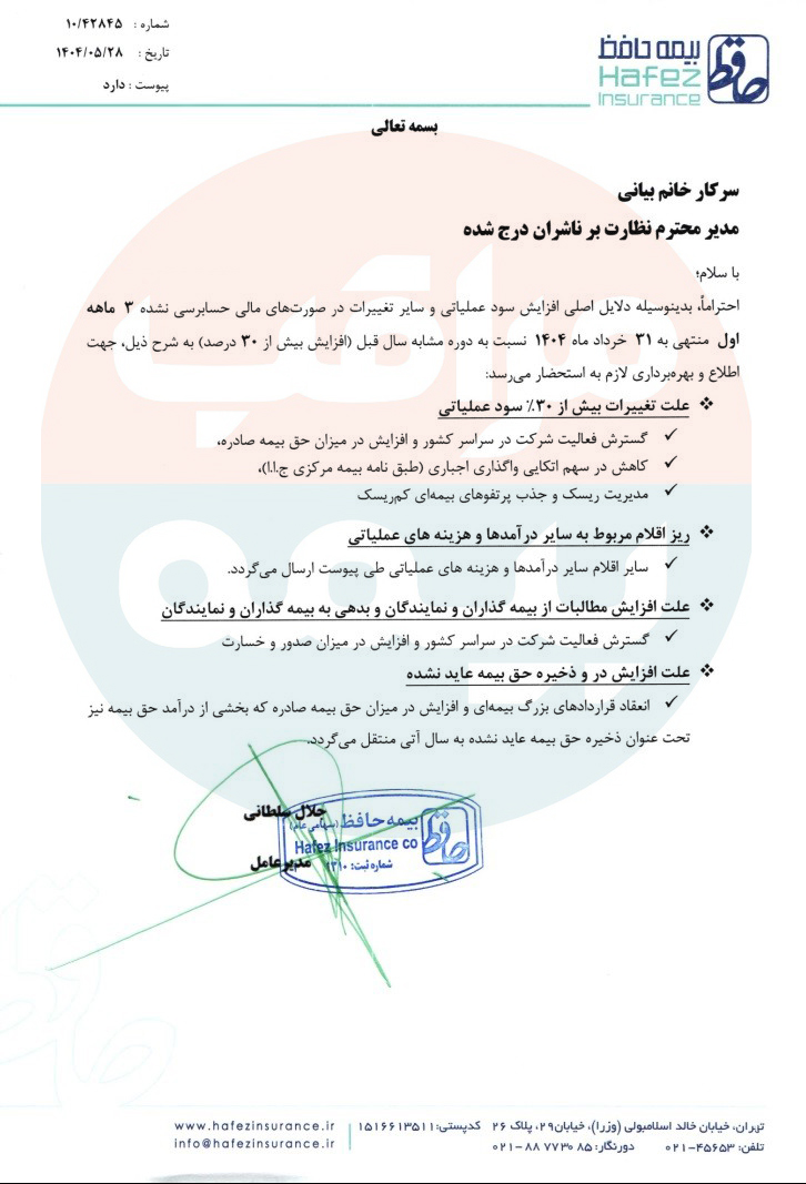 مراقب بیمه : شرکت بیمه حافظ در خصوص برخی موارد عملکرد و صورت های مالی توضیحات تکمیلی ارائه کرد.