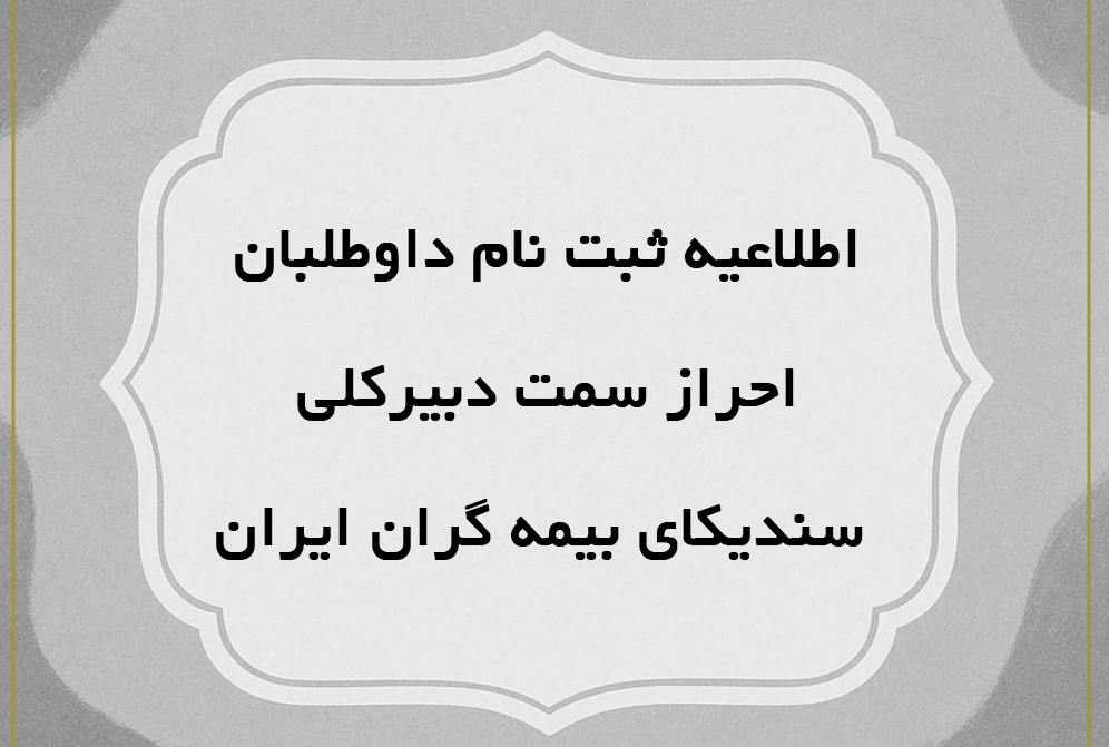 \r\n\r\nبه گزارش مراقب بیمه به نقل از روابط عمومی سندیکای بیمهگران ایران، به استحضار کلیه خبرگان و مدیران محترم صنعت بیمه میرساند، نظر به اینکه مدتزمان تصدی دوساله دبیرکل سندیکای بیمهگران ایران رو به اتمام است، لذا با عنایت به مفاد ماده ۱۷ اساسنامه سندیکا و بر اساس مصوبه هیئترئیسه محترم، از داوطلبان محترم احراز سمت دبیرکلی درخواست میشود از روز چهارشنبه مورخ ۱۴۰۴/۰۵/۲۹ لغایت ساعت ۱۴ روز چهارشنبه مورخ ۱۴۰۴/۰۶/۰۵ درخواست کتبی خود همراه با مشخصات کامل (پیشینه شغلی، مهارتی و تحصیلی) و برنامه کاری ۲ ساله را شخصاً و یا توسط نماینده به دبیرخانه سندیکای بیمهگران ایران واقع در میدان جهاد (دکتر فاطمی)، میدان سلماس، ضلع جنوب غربی میدان، خیابان ۶/۱، پلاک ۹۹ طبقه چهارم (جناب آقای طباخها) تحویل و رسید ممهور به مهر سندیکا را دریافت فرمایند.