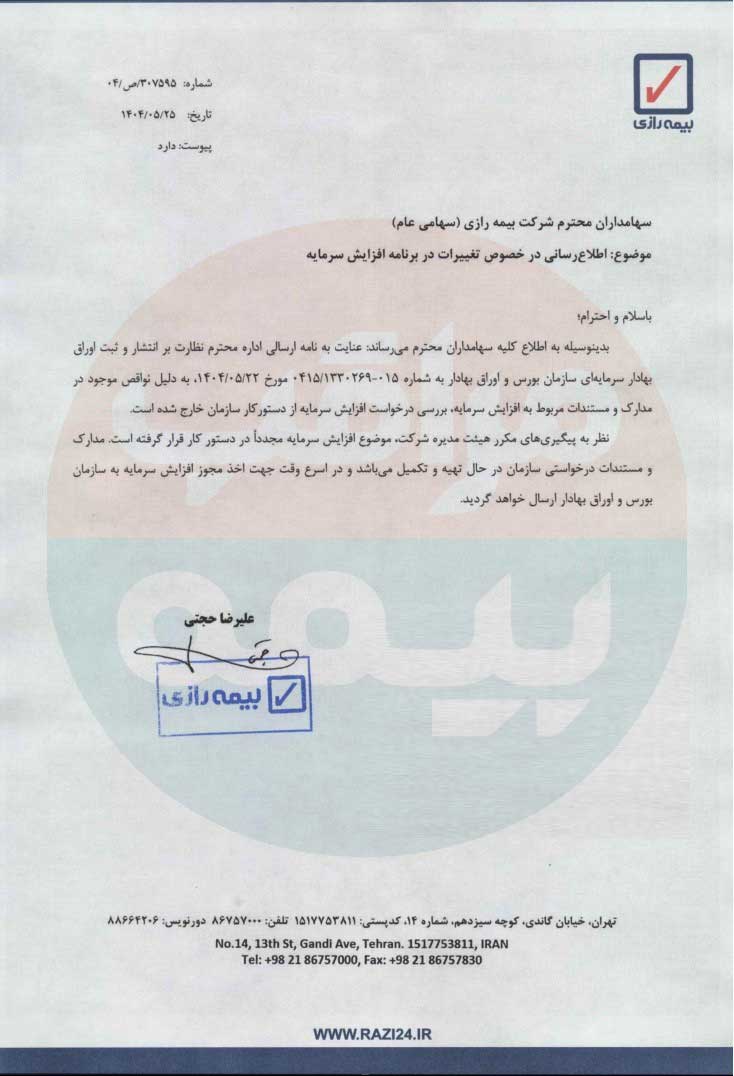 \r\n\r\n\r\n", "is_title": false, "is_link": false, "news": 5701 } ], "type": "news", "created_at": "2025-08-17T03:44:47.789947", "news_type": "news", "is_banner": true, "is_chief": false, "is_special": false, "is_insurance": false, "is_person": false, "view_number": 5, "is_publish": true, "publish_at": "2025-08-17", "creator": "admin1", "writer": 10 }, { "id": 5700, "news_detail": [ { "id": 7870, "cover": "https://api.moraghebbime.com/media/photos/news/cover/myFile_5ngQ5dN.jpg", "created_at": "2025-08-16T14:51:46.282905", "publish_at": "2025-08-16", "header": "افزایش سرمایه «بیمه رازی» پس از رفع نواقص دوباره در دستور کار قرار گرفت", "sub_header": ".", "person_name": null, "person_position": null, "homepage_description_for_chief": null, "brief_description": "", "news": 5700, "insurance_type": null } ], "ticket_num": 0, "writer_name": "مهتاب معبودی", "writer_detail": { "id": 10, "image_file": "https://api.moraghebbime.com/media/photos/writer/2405.jpg", "created_at": "2024-03-09T08:28:50.275318", "name": "مهتاب معبودی", "description": "روزنامه نگار", "position": "خبرنگار" }, "news_detail_multi": [], "news_tag_file": [], "news_image_file": [], "news_paragraph_file": [ { "id": 9635, "image_file": "EMPTY", "created_at": "2025-08-16T14:51:46.288378", "text": "مراقب بیمه : شرکت بیمه رازی در خصوص برنامه افزایش سرمایه شرکت اعلام کرد به دلیل نواقص موجود در مدارک و مستندات مربوط به افزایش سرمایه بررسی درخواست افزایش سرمایه از دستور کار سازمان خارج شده است. نظر به پیگیریهای مکرر هیئت مدیره شرکت موضوع افزایش سرمایه مجدداً در دستور کار قرار گرفته است.