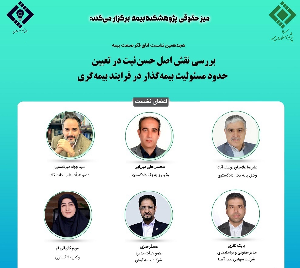 \r\nبه گزارش مراقب بیمه به نقل از روابط عمومی و امور بینالملل پژوهشکده بیمه، در این نشست، آقایان «سید جواد میرقاسمی، عضو هیات علمی دانشگاه»، «علیرضا غلامیان، وکیل پایه یک دادگستری»، «محسن علی میرزایی، وکیل پایه یک دادگستری»، «عسگر معزی، عضو هیات مدیره شرکت بیمه آرمان»، «بابک نظری، مدیر حقوقی و قراردادهای شرکت بیمه آسیا» و خانم «مریم کاویانی فر، وکیل دادگستری» در این خصوص به بحت و بررسی خواهند پرداخت.
