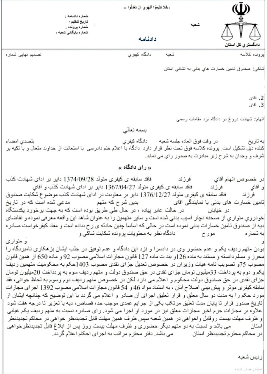 \r\nبه گزارش مراقب بیمه، در جریان این پرونده، پس از آنکه بواسطه تحقیقات میدانی همکاران صندوق و شناسایی ترکنشین موتورسیکلت و تحقیق از آنها مشخص شد که زیاندیده در قالب ادعایی متقلبانه، در حالیکه راکب موتورسیکلت بوده و خود را بعنوان عابر پیاده معرفی کروه و با مشارکت دو نفر از دوستان خویش بعنوان شاهد کذب، سعی در اخذ دیه از صندوق را داشته، بلافاصله با احراز تقلب و اقدام حقوقی مقتضی صندوق و طرح شکایت کیفری علیه این افراد، در نهایت اتهام ایشان احراز و شخص زیانخواه متهم ردیف دوم به اتهام معاونت در معرفی و ادای شهادت کذب و شهود تعرفه شده متهمین ردیف اول و سوم نیز بجرم ادای شهادت کذب در نزد مقام رسمی به ترتیب هر یک به جزای نقدی به مبالغ سیصد و سی میلیون ریال متهم ردیف اول و دوم و دویست میلیون ریال (متهم ردیف سوم) محکوم شده اند.
