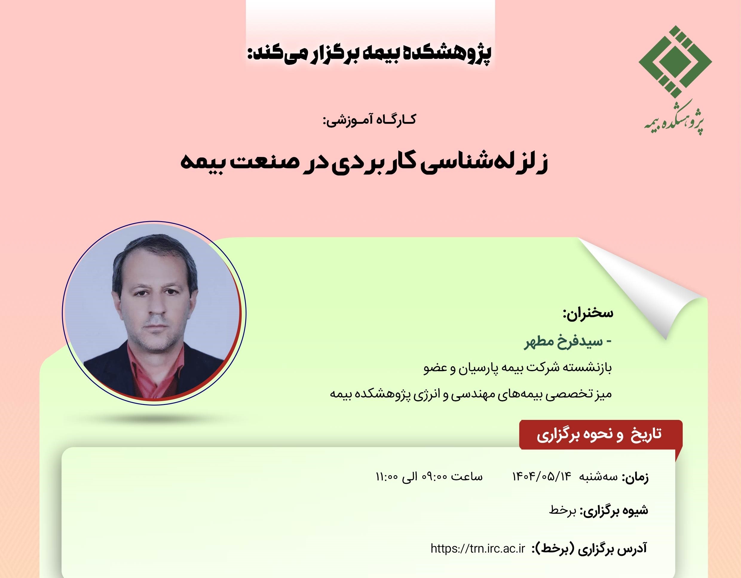 \r\n\r\nبه گزارش مراقب بیمه به نقل از روابط عمومی و امور بینالملل پژوهشکده بیمه، در این کارگاه آموزشی محورهای «مفاهیم پایه ای مهندسی زلزله»، «نقش و تاثیر گسلها و امواج زلزله در ارزیابی بیمه ای ریسک زلزله»، «آثار مستقیم و غیرمستقیم زلزله بر ساختمانهای مورد بیمه» و «ملاحظات سازه ای و غیرسازه ای کارشناسی در ارزیابی بیمه ای ریسک زلزله» توسط آقای سیدفرخ مطهر، بازنشسته شرکت بیمه پارسیان و عضو میز تخصصی بیمه های مهندسی و انرژی پژوهشکده بیمه ارائه خواهد شد.