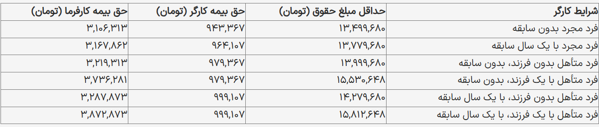 \r\n\r\n\r\nمطابق جدول اعلامی، حداقل حقوق برای یک فرد مجرد بدون سابقه بیمه، ۱۳ میلیون و ۴۹۹ هزار و ۶۸۰ تومان تعیین شده و در این حالت، سهم بیمه کارگر ۹۴۳ هزار و ۳۶۷ تومان و سهم کارفرما ۳ میلیون و ۱۰۶ هزار و ۳۱۳ تومان خواهد بود.