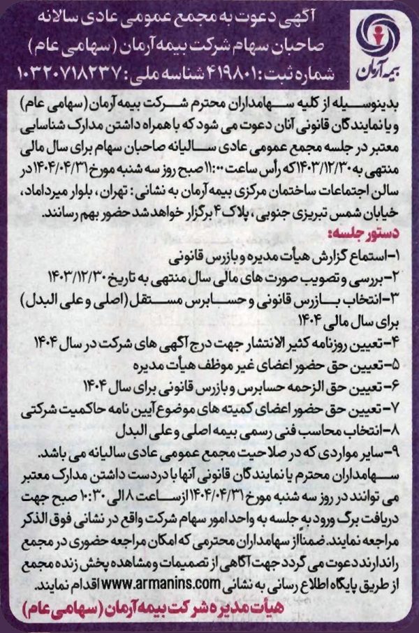 \r\nبه گزارش مراقب بیمه، مجمع عمومی عادی سالیانه شرکت بیمه آرمان 31تیرماه 1404 برگزار میشود