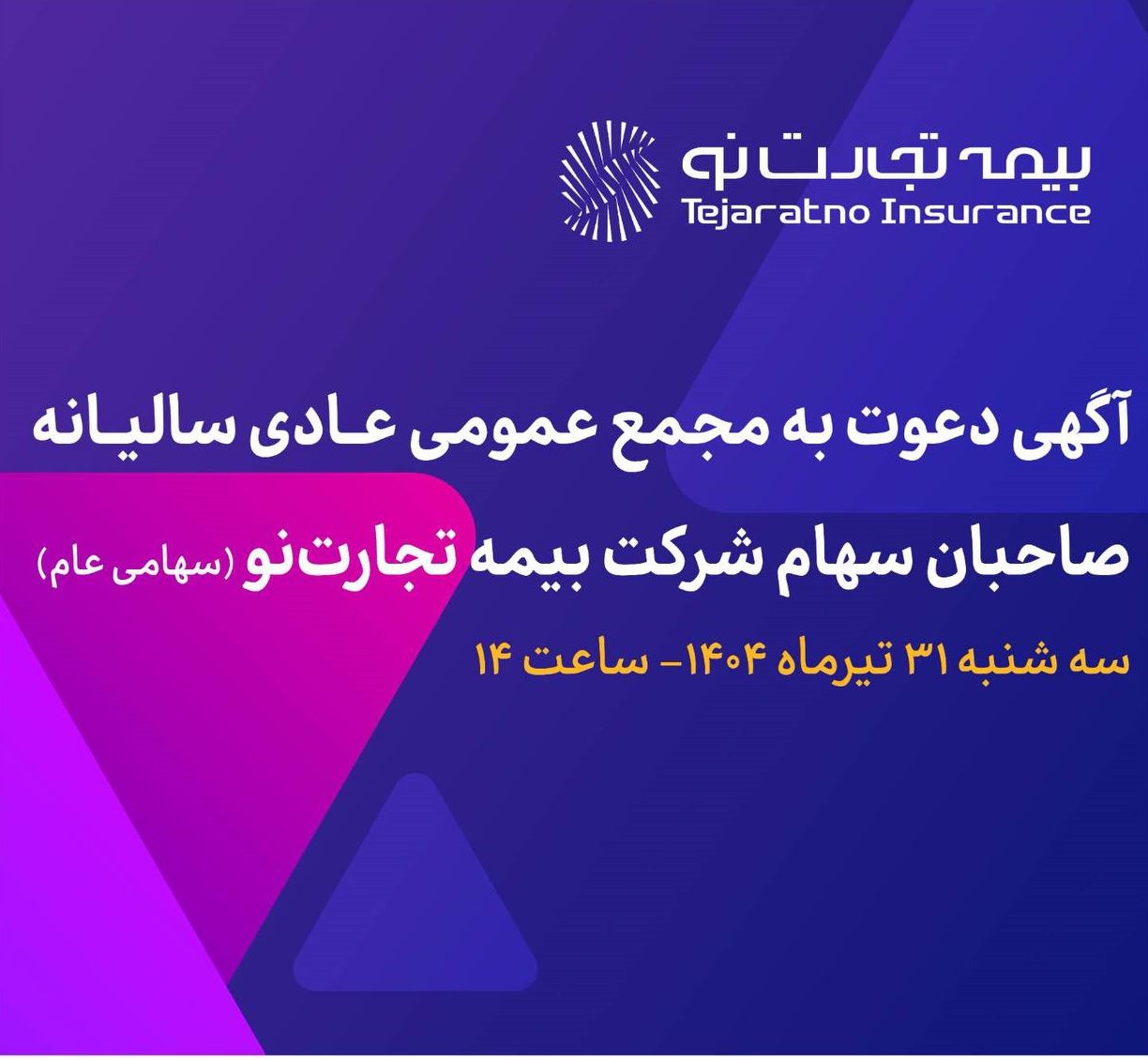 \r\nبدینوسیله از کلیه سهامداران محترم شرکت بیمه تجارتنو (سهامی عام) دعوت به عمل میآید تا در جلسه مجمع عمومی عادی سالیانه صاحبان سهام این شرکت که در ساعت 14 روز سهشنبه مورخ 1404/04/31 در تالار قلم مرکز همایشهای کتابخانه ملی به نشانی بزرگراه شهید حقانی (غرب به شرق)، بعد از ایستگاه مترو حقانی، بلوار کتابخانه ملی، درب غربی ساختمان کتابخانه ملی برگزار میگردد، حضور به هم رسانند.
