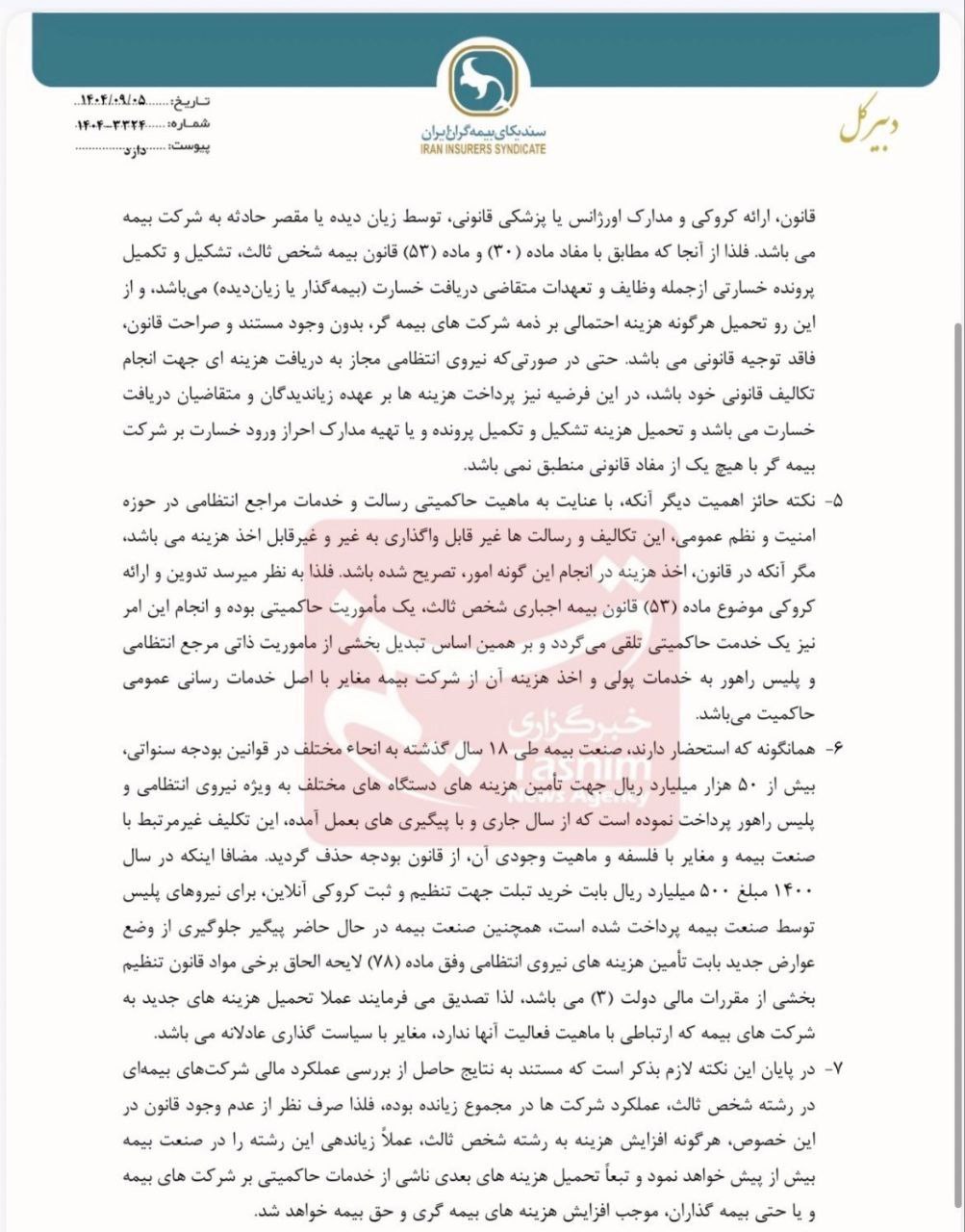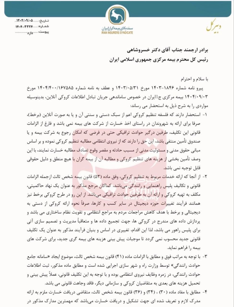 \r\n\r\nدر نامه سندیکا که خطاب به رئیسکل بیمه مرکزی ارسال شده، صراحتاً هشدار داده شده که تنظیم کروکی، چه کاغذی چه آنلاین، وظیفه حاکمیتی پلیس است و هرگونه «پولیسازی» این فرایند، از نظر قانونی بیپایه است. سندیکا همچنین یادآوری کرده که صنعت بیمه سال گذشته بیش از پنجاههزار میلیارد ریال به شکل مستقیم برای تجهیز پلیس هزینه کرده و اکنون، تلاش برای باز کردن مسیرهای هزینهزا دوباره، فاقد هرگونه توجیه است.