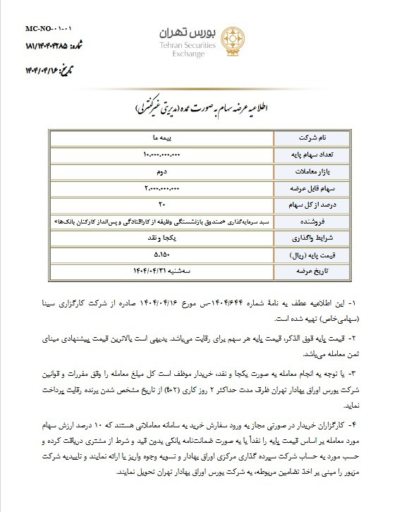 \r\n\r\nطبق این اطلاعیه، قرار است تعداد ۲ میلیارد سهم معادل ۲۰ درصد از کل سهام شرکت بیمه ما که متعلق به “صندوق بازنشستگی وظیفه و پسانداز کارکنان بانکها” است، به صورت نقد و یکجا از طریق کارگزاری سینا عرضه شود.