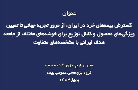 \r\nدر همین راستا، پژوهشکده بیمه طرحی پژوهشی با عنوان «گسترش بیمههای خرد در ایران:از مرور تجربه جهانی تا تعیین ویزگیهای محصول و کانال توزیع برای خوشههای مختلف جامعه هدف ایرانی با مشخصههای متفاوت» را در دستور کار قرار داده است. این طرح با هدف مرور تجربیات جهانی و تعیین ویژگیهای محصول بیمهای مناسب، و با حمایت همهجانبه شرکت بیمه سامان، طراحی شده است.