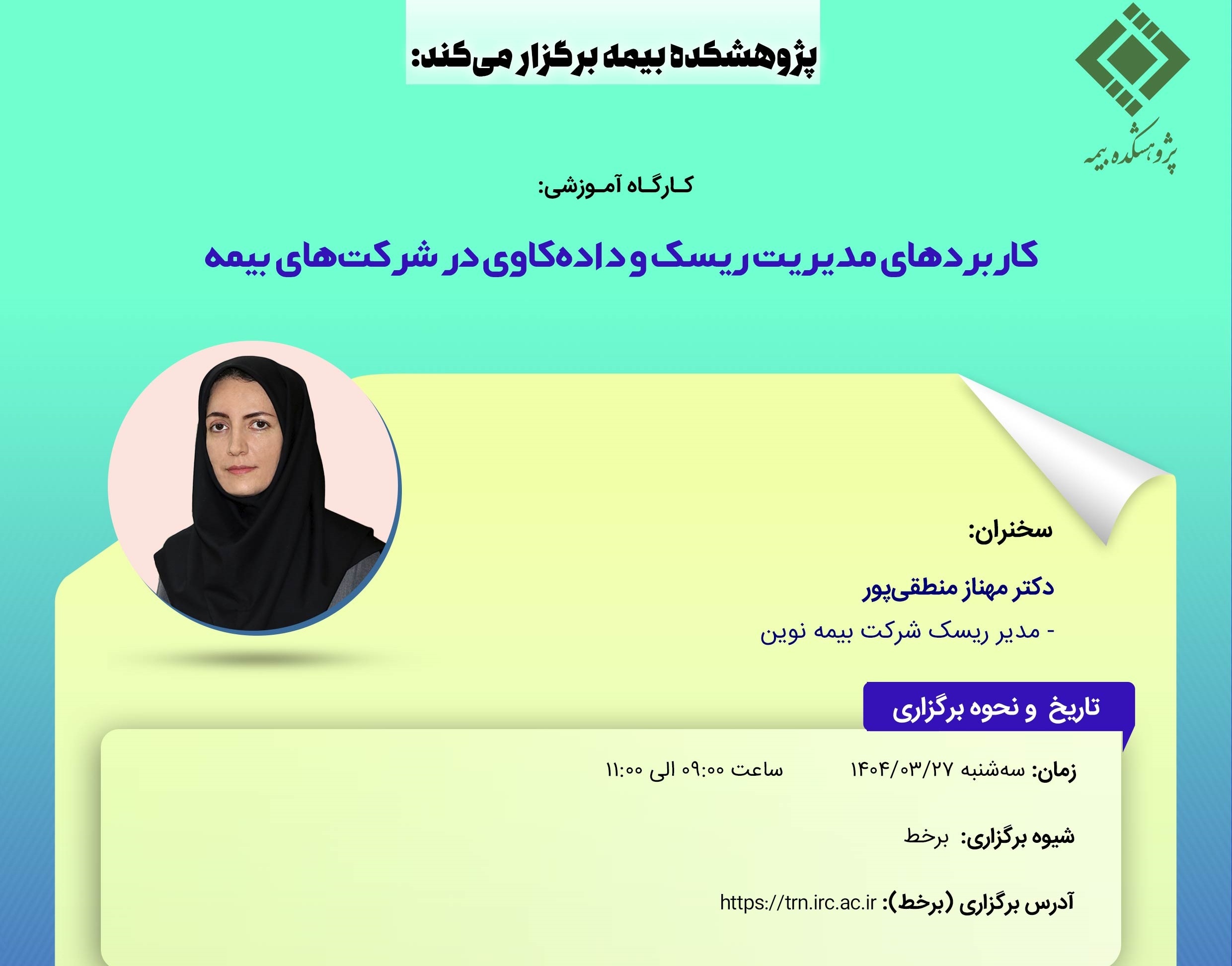 کارگاه آموزشی «کاربردهای مدیریت ریسک و داده کاوی در شرکتهای بیمه» از ساعت 9:00 تا 11:00 روز سهشنبه 27 خرداد 1404 به صورت برخط از طریق سامانه مدیریت یادگیری پژوهشکده بیمه برگزار میشود.