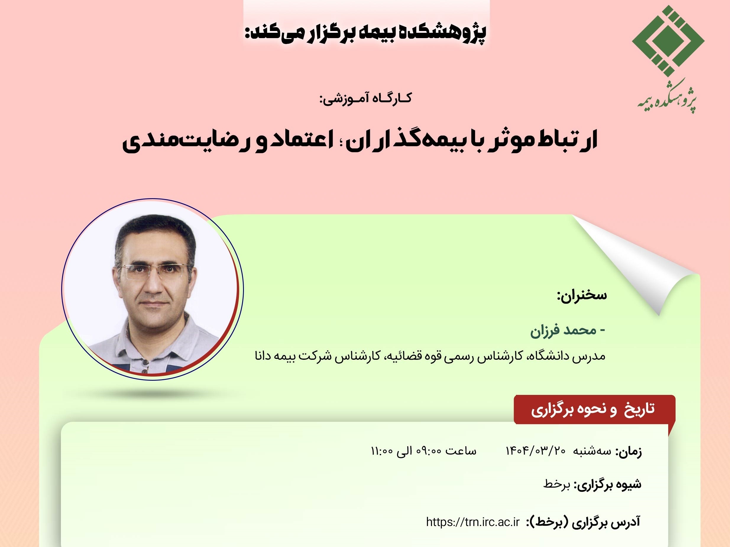 \r\n\r\nحضور در این نشست برای عموم آزاد و مستلزم ثبتنام از طریق سامانه مدیریت یادگیری پژوهشکده بیمه به نشانی https://trn.irc.ac.ir میباشد.
