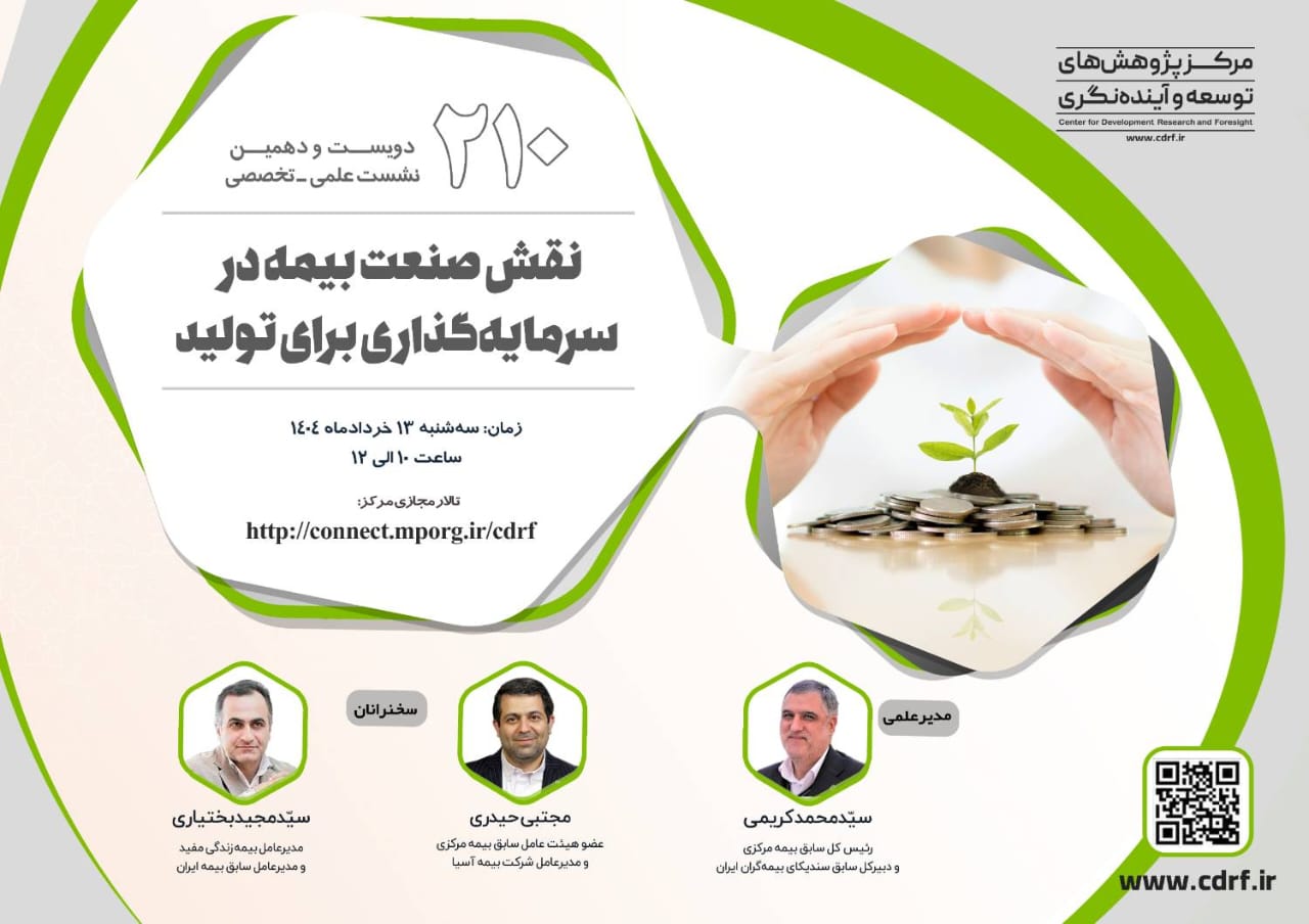 \r\nعلاقهمندان میتوانند با مراجعه به تالار مجازی مرکز پژوهشهای توسعه و آیندهنگری به نشانی http://connect.mporg.ir/cdrf در این نشست شرکت نمایند.
