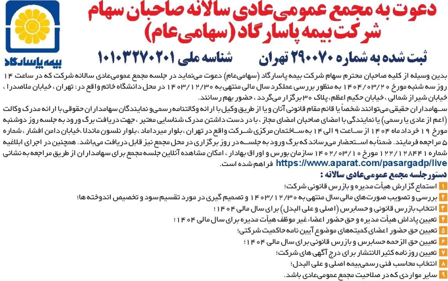 \r\nبه گزارش مراقب بیمه به نقل از روابط عمومی بیمه پاسارگاد ، بدینوسیله از کلیه صاحبان محترم سهام شرکت بیمه پاسارگاد (سهامی عام) دعوت می نماید در جلسه مجمع عمومی عادی سالانه شرکت که در ساعت ۱۴ روز سه شنبه مورخ ۱۴۰۴/۰۳/۲۰ به منظور بررسی عملکرد سال مالی منتهی به ۱۴۰۳/۱۲/۳۰ در محل دانشگاه خاتم واقع در : تهران ، خیابان ملاصدرا ، خیابان شیراز شمالی ، خیابان حکیم اعظم، پلاک ۳۰ برگزار می گردد حضور بهم رسانند.
