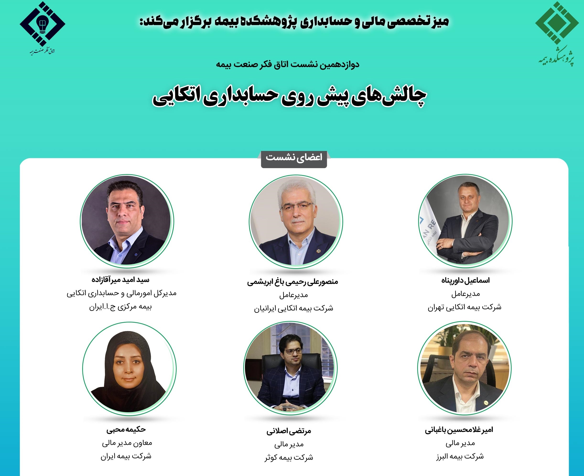 \r\nبه گزارش مراقب بیمه به نقل از روابط عمومی و امور بینالملل پژوهشکده بیمه، در این نشست، آقایان «اسماعیل داورپناه، مدیر عامل شرکت بیمه اتکایی تهران»، «منصورعلی رحیمی باغ ابریشمی، مدیر عامل شرکت بیمه اتکایی ایرانیان»، «سید امید میرآقازاده، مدیر کل امور مالی و حسابداری اتکایی بیمه مرکزی ج.ا. ایران»، «مرتضی اصلانی، مدیر مالی شرکت بیمه کوثر»، «امیر غلامحسین باغبانی، مدیر مالی شرکت بیمه البرز» و خانم «حکیمه محبی، معاون مدیر مالی شرکت بیمه ایران» به بحت و بررسی در این خصوص خواهند پرداخت.