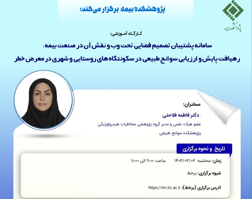 \r\n\r\n\r\nبه گزارش مراقب بیمه به نقل از روابط عمومی و امور بینالملل پژوهشکده بیمه، در این کارگاه آموزشی محورهای «مفاهیم اولیه، چالش ها و ضرورت ها»، «شناسایی و اولویت بندی سکونتگاههای درمعرض خطر سوانح طبیعی»، «ارزیابی و ارائه شیوه مداخله ایمن سازی» و «طراحی و استقرار سامانه اطلاعات مکانی و نقش آن در صنعت بیمه» توسط خانم دکتر فاطمه فلاحتی، عضو هیاتعلمی و مدیر گروه پژوهشی مخاطرات هیدرولوژیکی، پژوهشکده سوانح طبیعی، ارائه خواهد شد.