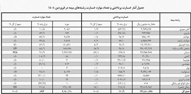 \r\n\r\nاز سوی دیگر، میزان خسارات پرداختی بیمهای در فروردین ماه سال جاری، 7.1 میلیون فقره خسارت به ارزش 19.6 هزار میلیارد تومان بوده که حاکی از رشد 110 درصدی در تعداد ارزش خسارات پرداختی و رشد 59 درصدی در تعداد موارد خسارات پرداختی، است.