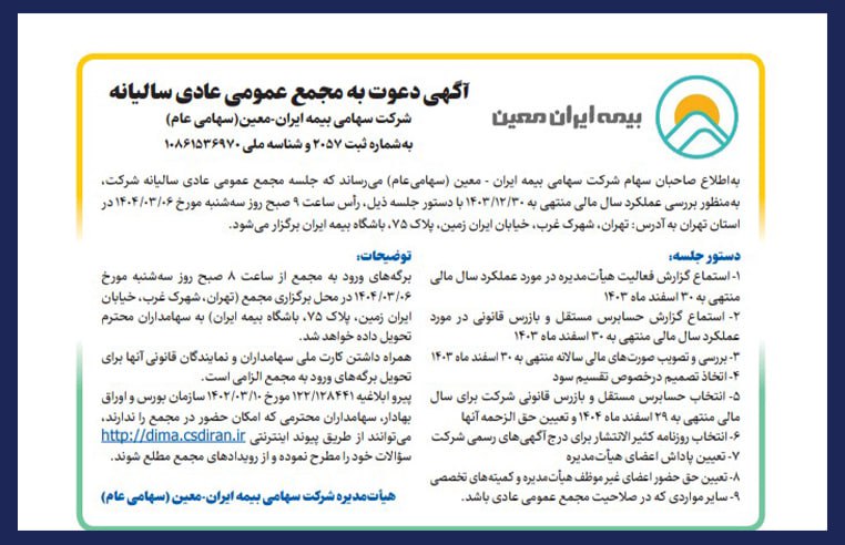 \r\nبه گزارش مراقب بیمه به نقل از باشگاه بیمه گران، در این مجمع که ساعت ۹ صبح ۶ خرداد در محل باشگاه بیمه ایران برگزار میشود، استماع گزارش فعالیت هیأت مدیره در مورد عملکرد سال مالی منتهی به ۳۰ اسفند ماه ۱۴۰۳، استماع گزارش حسابرس مستقل و بازرس قانونی در مورد عملکرد سال مالی منتهی به ۳۰ اسفند ماه ۱۴۰۳، بررسی و تصویب صورتهای مالی سالانه منتهی به ۳۰ اسفند ماه ۱۴۰۳، اتخاذ تصمیم در خصوص تقسیم سود، انتخاب حسابرس مستقل و بازرس قانونی شرکت برای سال مالی منتهی به ۲۹ اسفند ماه ۱۴۰۴ و تعیین حق الزحمه آنها، انتخاب روزنامه کثیر الانتشار برای درج آگهیهای رسمی شرکت، تعیین پاداش اعضای هیأت مدیره، تعیین حق حضور اعضای غیر موظف هیأت مدیره و کمیتههای تخصصی و سایر مواردی که در صلاحیت مجمع عمومی عادی باشد، به عنوان دستور جلسه مجمع در حضور حداکثری سهامداران بررسی و رأی گیری خواهد شد.