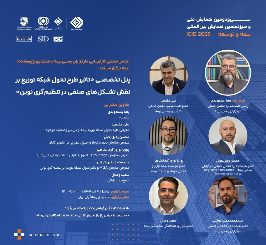 \r\nدر این پنل، علی مقیمی، محسن رجیل بخش، پوریا نوروز کرمانشاهی، سید محمدمتین توکلی مقالاتی با عناوین «معرفی طرح تحول شبکه توزیع بیمه و بررسی وضعیت موجود»، «معرفی سازمان Brokerage و اصول نظارتی در آنتاریو کانادا» و «معرفی سازمان MGA و تاثیر تحول شبکه توزیع بر تنظیم گری نوین» را ارائه و و سعید وصال به جمعبندی نهایی خواهد نمود.این نشست علمی، بخشی از برنامههای محتوایی همایش بیمه و توسعه است که با هدف تقویت نقش نهادهای صنفی و تخصصی در ساختار تنظیمگری مشارکتی صنعت بیمه کشور برگزار میشود.