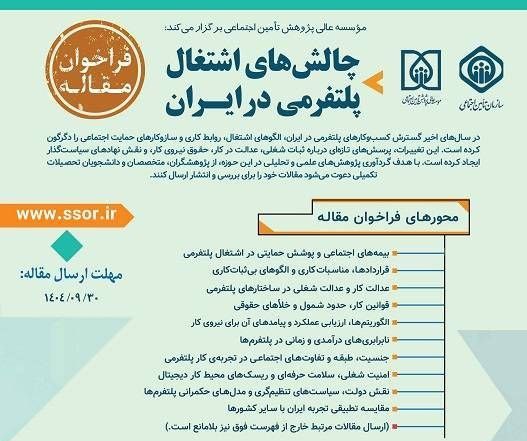 \r\n", "is_title": false, "is_link": false, "news": 6718 } ], "type": "news", "created_at": "2025-11-23T10:19:20.042463", "news_type": "news", "is_banner": false, "is_chief": false, "is_special": false, "is_insurance": false, "is_person": false, "view_number": 3, "is_publish": true, "publish_at": "2025-11-23", "creator": "admin1", "writer": 2 }, { "id": 6717, "news_detail": [ { "id": 9009, "cover": "https://api.moraghebbime.com/media/photos/news/cover/photo_2025-11-23_12-31-24.jpg", "created_at": "2025-11-23T09:02:54.999617", "publish_at": "2025-11-23", "header": "فراخوان مقاله «چالشهای اشتغال پلتفرمی در ایران»", "sub_header": "موسسه عالی پژوهش تامیناجتماعی برگزار میکند:", "person_name": null, "person_position": null, "homepage_description_for_chief": null, "brief_description": "", "news": 6717, "insurance_type": null } ], "ticket_num": 0, "writer_name": "مراقب بیمه", "writer_detail": { "id": 2, "image_file": "https://api.moraghebbime.com/media/photos/writer/0fe5c17b-78fe-45c6-b925-7d5d5ca2e275.jpeg", "created_at": "2023-06-02T08:13:06.223330", "name": "مراقب بیمه", "description": "null", "position": "رسانه تخصصی صنعت بیمه" }, "news_detail_multi": [], "news_tag_file": [], "news_image_file": [], "news_paragraph_file": [ { "id": 10815, "image_file": "EMPTY", "created_at": "2025-11-23T09:02:55.008949", "text": "\r\n\r\nبه گزارش مراقب بیمه به نقل از روابط عمومی موسسه عالی پژوهش تامین اجتماعی، در این فراخوان آمده است: در سالهای اخیر گسترش کسبوکارهای پلتفرمی در ایران، الگوهای اشتغال، روابط کاری و سازوکارهای حمایت اجتماعی را دگرگون کرده است. این تغییرات، پرسشهای تازهای درباره ثبات شغلی، عدالت در کار، حقوق نیروی کار، و نقش نهادهای سیاستگذار ایجاد کرده است.