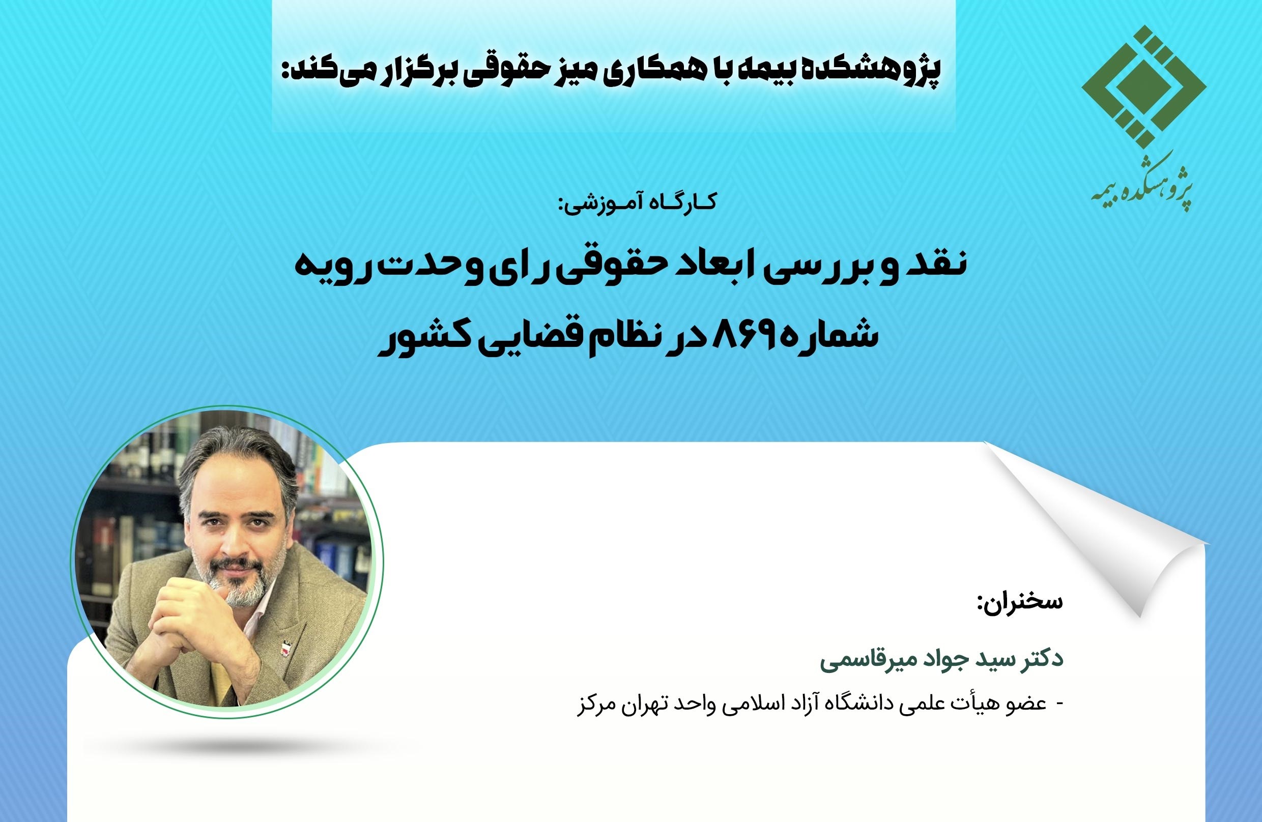\r\n\r\nبه گزارش مراقب بیمه به نقل از روابط عمومی و امور بینالملل پژوهشکده بیمه، در این نشست آموزشی آقای دکتر سیدجواد میرقاسمی، عضو هیات علمی دانشگاه آزاد اسلامی واحد تهران مرکز، به بحث و بررسی در خصوص محورهای «ارزیابی آثار حقوقی رای وحدت رویه 869 در صنعت بیمه و نظام قضایی کشور» و «ارزیابی پیامدهای اجرایی رای وحدت رویه 869 در صنعت بیمه و نظام قضایی کشور» خواهند پرداخت.
