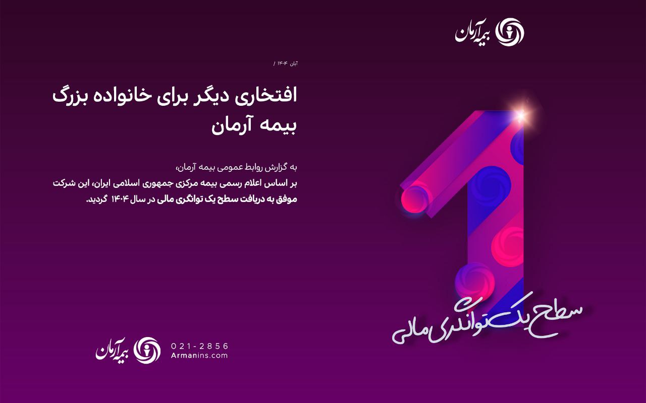 \r\n\r\nبه گزارش مراقب بیمه به نقل از روابط عمومی بیمه آرمان، بر اساس اعلام رسمی بیمه مرکزی، این شرکت در ارزیابی توانگری مالی سال ۱۴۰۴ موفق به کسب سطح یک توانگری مالی و رتبه هفتم میان شرکتهای بیمه کشور گردیده است.
