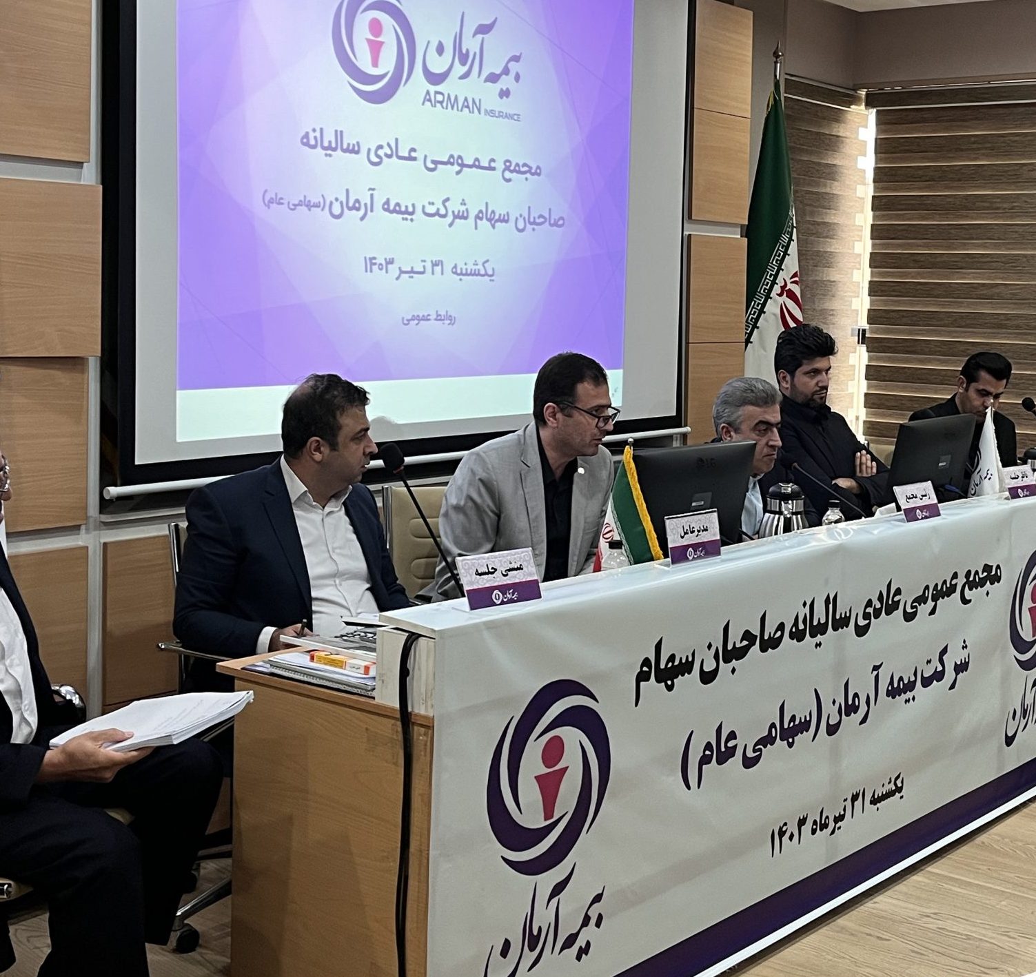 \r\nگفتنی است این مجمع به ریاست دکتر رضا آقا بابایی رئیس هیئت مدیره شرکت بیمه آرمان، برگزار شد و پس از ارائه گزارش هیئت مدیره و قرائت گزارش حسابرس مستقل و بازرس قانونی و پاسخ به سوالات مطرح شده سهامداران، صورتهای مالی سال مالی منتهی به ۲۹ اسفند۱۴۰۲ توسط سهامداران به تأیید رسید.