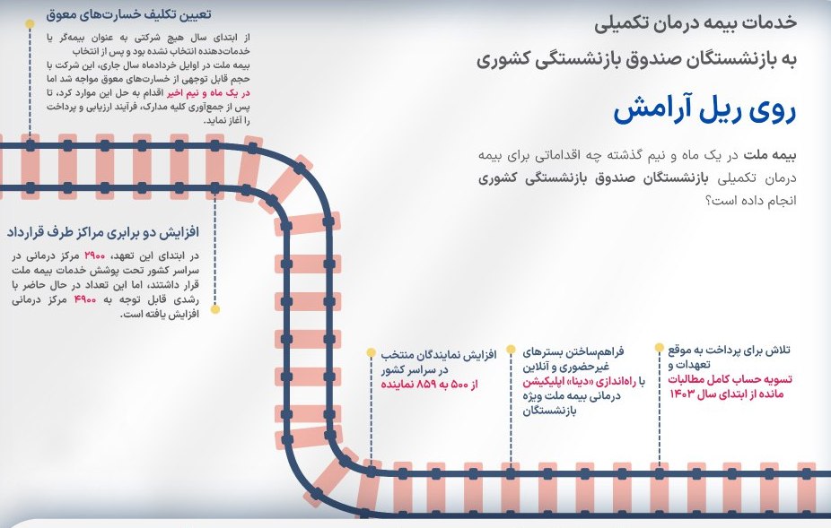 \r\nبیمه درمان تکمیلی بازنشستگان صندوق بازنشستگی کشوری در اوایل خردادماه ۱۴۰۳ به شرکت بیمه ملت واگذار شد و به دلیل اینکه از ابتدای سال هیچ شرکتی به عنوان خدمات دهنده و یا بیمهگر انتخاب نشده بود، حجم زیادی از پروندههای خسارتی دو ماه فروردین و اردیبهشتماه سال 1403 در دستان بازنشستگان عزیز وجود داشت که به یکباره با مشخص شدن شرکت بیمه ملت به عنوان بیمه گر این قرارداد، شاهد مراجعه و ازدحام این عزیزان به سمت دفاتر و نمایندگیهای بیمه ملت بودیم.