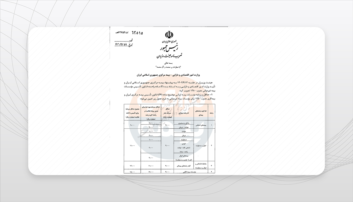 \r\nبه گزارش مراقب بیمه ، تصویب نامه مصوب جلسه مورخ 1403/04/13 هیات وزیران درخصوص «تعیین حداقل سرمایه موسسات بیمه ایرانی موضوع ماده 36 قانون تاسیس بیمه مرکزی ایران و بیمه گری مصوب 1350 برای موسسات بیمه غیر دولتی» طی نامه شماره 62515 مورخ 1403/04/18 توسط محمد مخبر معاون اول رییس جمهور ابلاغ شد.