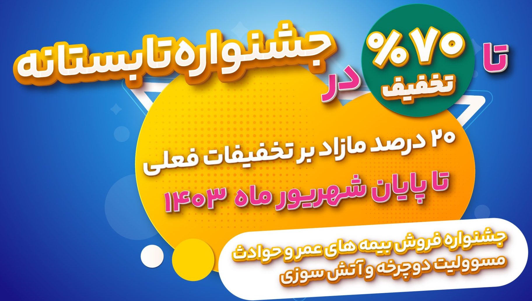 \r\nبه گزارش مراقب بیمه به نقل از روابط عمومی بیمه ملت، همزمان با فرا رسیدن فصل تابستان و تقارن آن با اعیاد سعید غدیر و ولادت امام هفتم شیعیان، حضرت امام موسی کاظم (ع)، شرکت بیمه ملت اقدام به برگزاری جشنی بیمهای با عنوان «جشنواره تابستانی بیمه» کرده است. این جشنواره که از 7 تیرماه 1403 آغاز شده و تا 31 شهریورماه 1403 ادامه خواهد داشت، فرصتی استثنایی برای متقاضیان خرید بیمه است تا با بهرهمندی از تخفیفهای ویژه، از مزایای پوشش بیمهای در این ایام خاص بهرهمند شوند.