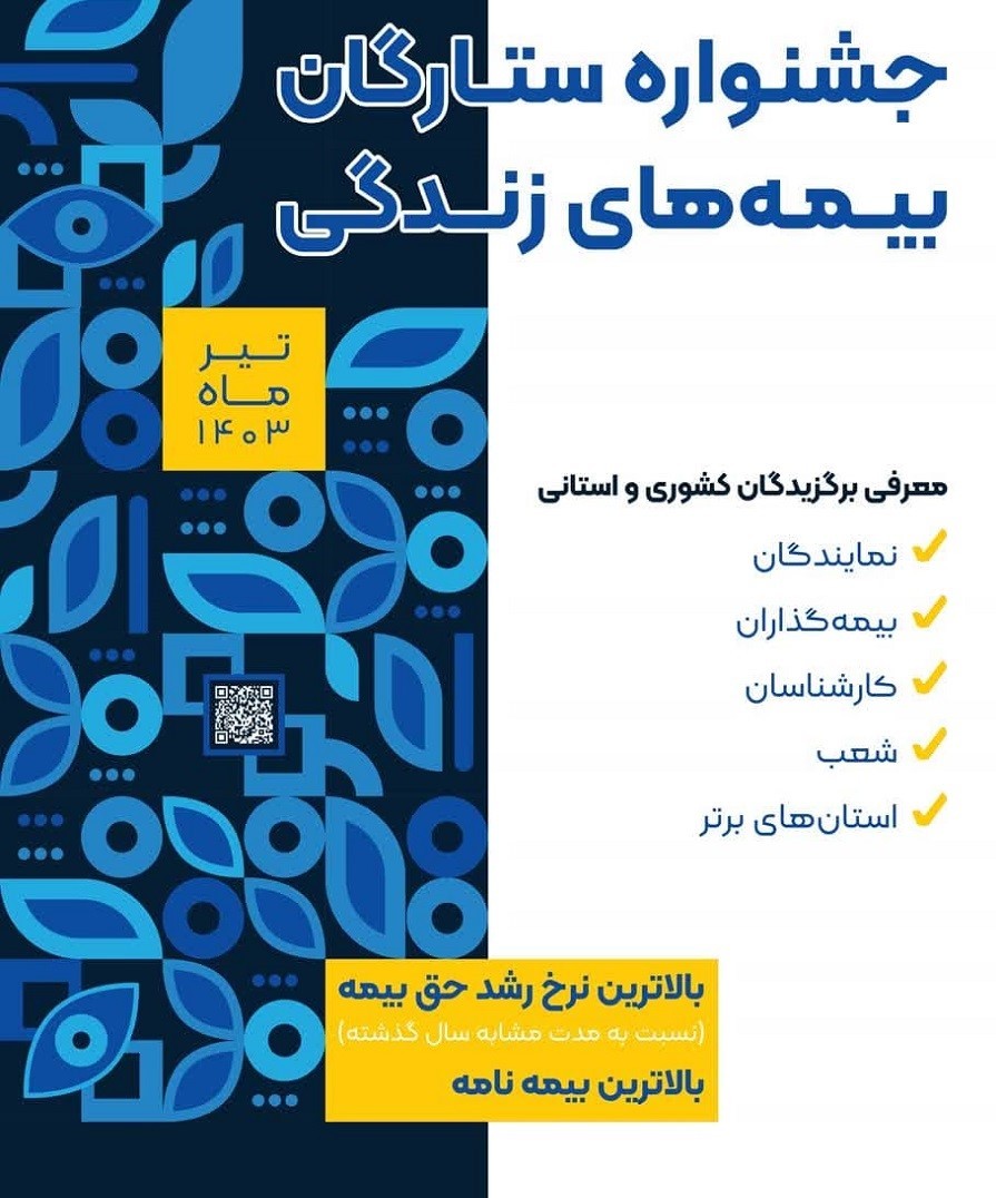 جشنواره « ستارگان بیمه¬ های زندگی » با هدف توسعه و ترویج بیمههای زندگی و تشویق و تجلیل از نمایندگان، کارشناسان، شعب و استانهای برتر در زمینه صدور بیمههای زندگی، از تاریخ 1403/4/1 لغایت 1403/4/31 در سراسر کشور برگزار می¬ شود.