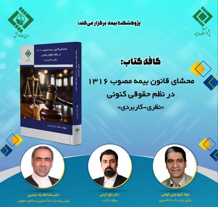 \r\n\r\nبه گزارش مراقب بیمه به نقل از روابط عمومی و امور بینالملل پژوهشکده بیمه، در این کافه کتاب آقایان «دکتر داود کرمی»، «دکتر ماشاءاله بناءنیاسری» و «جواد گیوهچینکوهی» به بحث و تبادل نظر در این خصوص خواهند پرداخت.