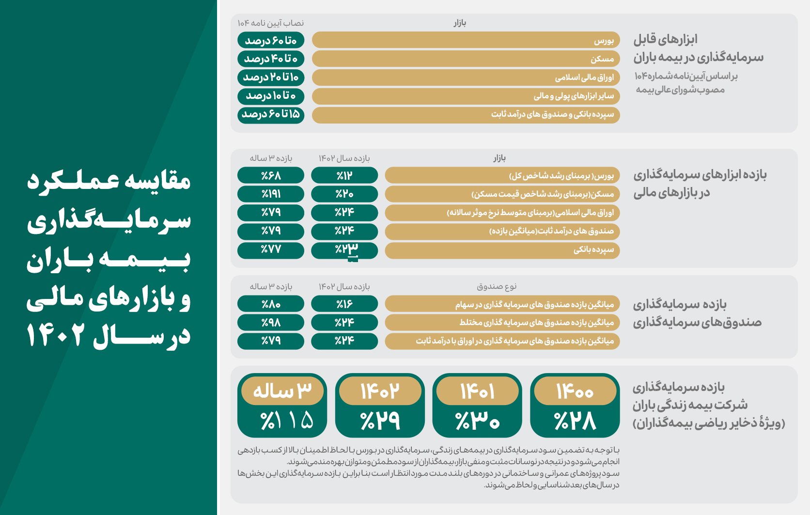 \r\nاگرچه مقایسه بیمههای زندگی با سایر ابزارهای مالی به دلیل ماهیت متفاوت، شاید چندان علمی و منطقی به نظر نرسد، با این وجود برای افرادی که در آستانه تصمیمگیری برای سرنوشت مالی خود و خانوادهشان هستند، این مقایسهها میتواند راهگشا و کارساز باشد. با همین دیدگاه، جدول زیر به طور خلاصه و با تکیه بر آمار و ارقام بیانگر عملکرد خوب بیمه باران است و تاکیدی بر این گزاره که با نوآوری و خلاقیت میتوان توجه آحاد جامعه به بیمههای زندگی را به عنوان ابزاری بدون ریسک و با بازدهی معقول برای تامین آتیه جلب کرد.