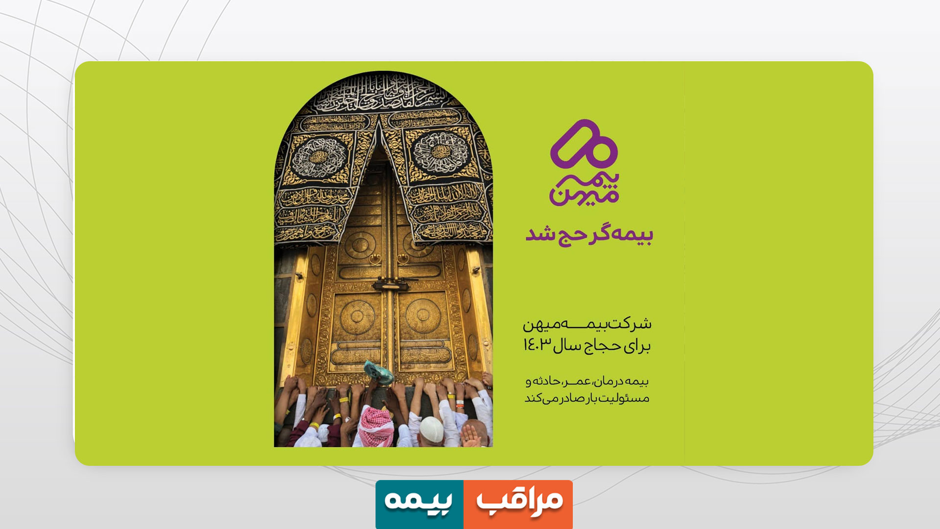 \r\nبه گزارش مراقب بیمه و به نقل از روابط عمومي بيمه ميهن، پوشش بيمه گروهی درمان، عمر، حادثه و مسئوليت بار حجاج ايراني در حج تمتع سال ۱۴۰۳، بر اساس قانون بيمه مصوب سال ۱۳۱۶ و شرايط عمومی بيمهنامههای درمان، عمر، حادثه و مسئوليت بار و آئيننامههای شورای عالی بيمه و شرايط اختصاصی مورد نظر بيمهگذار انجام میشود.