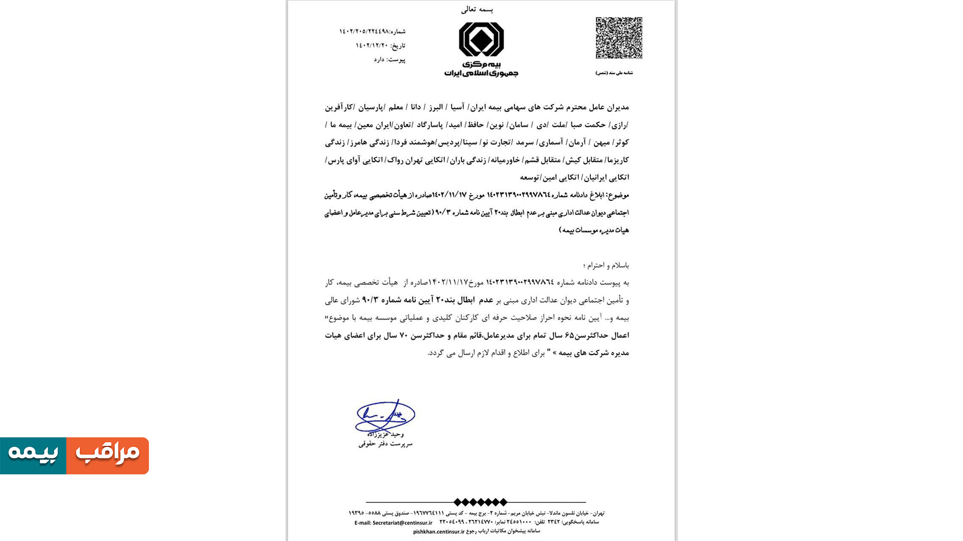 \r\nبه طوری که آییننامه نحوه احراز صلاحیت حرفهای کارکنان کلیدی و عملیاتی موسسه بیمه با موضوع «اعمال حداکثر سن 65 سال تمام برای مدیرعامل، قائم مقام و حداکثر سن 70 سال برای اعضای هیات مدیره شرکتهای بیمه» مورد ابطال واقع نشد.