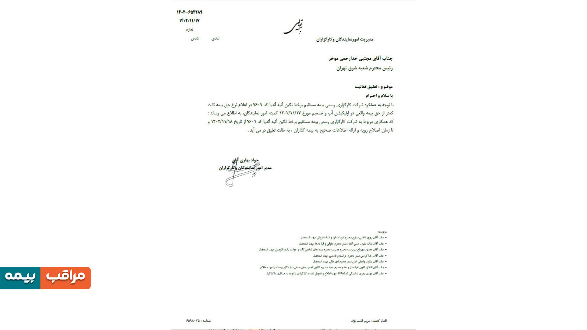 \r\nبه گزارش انجمن صنفی فروشندگان بیمه آسیا، باتوجه به اعتراض شبکه فروش نسبت به فروش بیمه شخص ثالث کمتر از نرخ تعیین شده، همکاری بیمه آسیا و کارگزاری آنلاین نگین آتیه آندیا (آپ) از 18 بهمن ماه به حالت تعلیق درآمد.