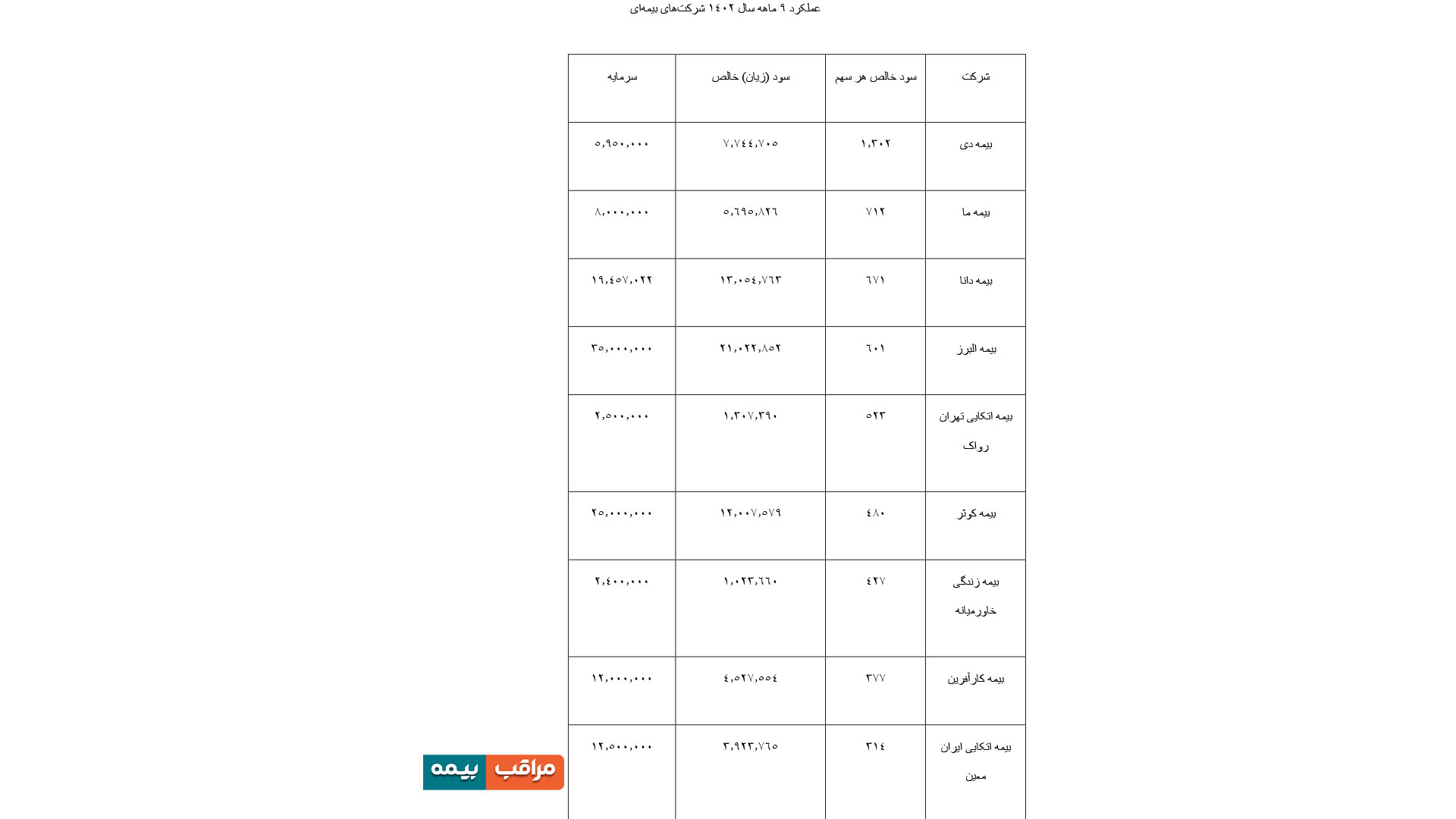 \r\nاین درحالی است که در این گزارش از شرکتهای بیمه دی، بیمه ما و دانا بهترتیب با 1.302، 712 و 671 ریال سود خالص هر سهم به عنوان بیشترین دارنده سود خالص نام برده شده است.