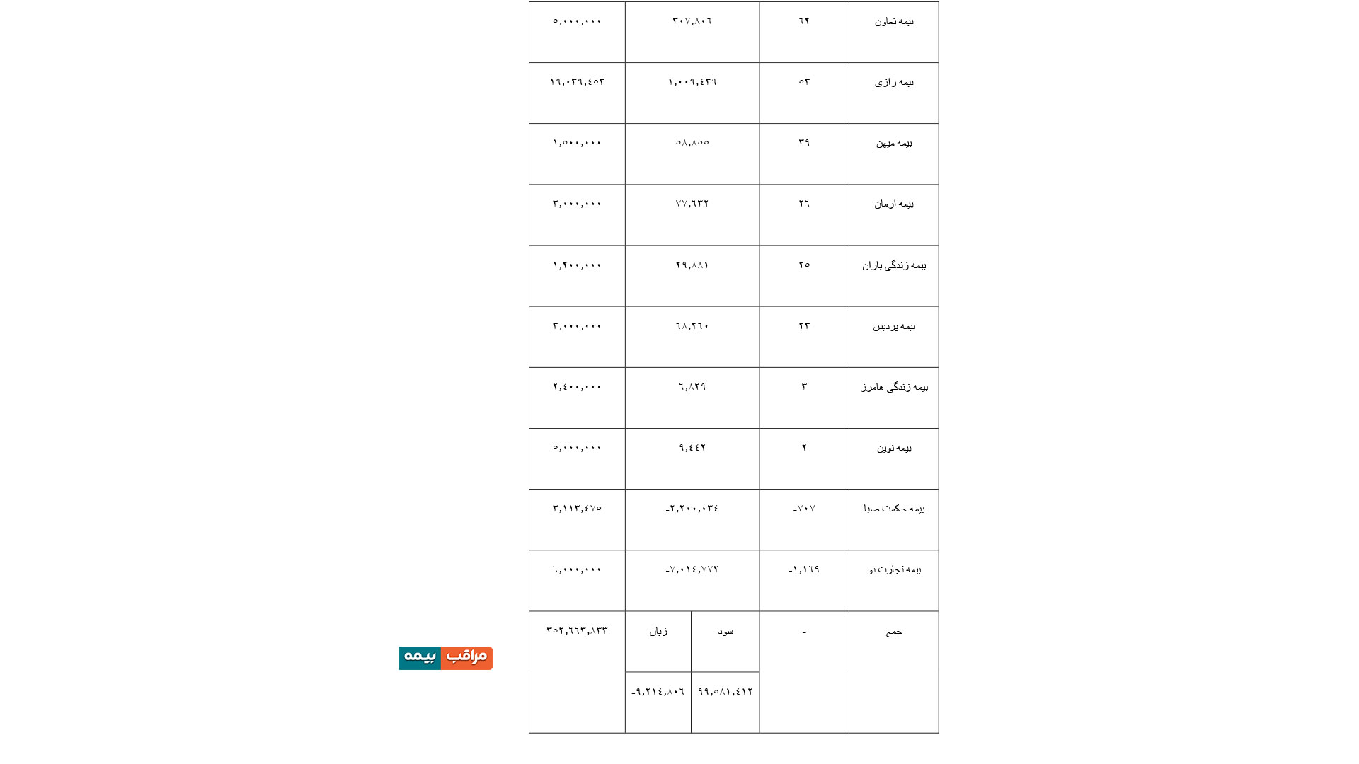 \r\nشرکت های بیمه اتکایی ایرانیان، اتکایی امین، هوشمند فردا، اتکایی سامان و اتکایی آوای پارس نیز به دلیل تفاوت در سال مالی در این گزارش در نظر گرفته نشده اند. این درحالی است که صورت مالی شرکت بیمه دولتی ایران نیز منتشر نشده است.