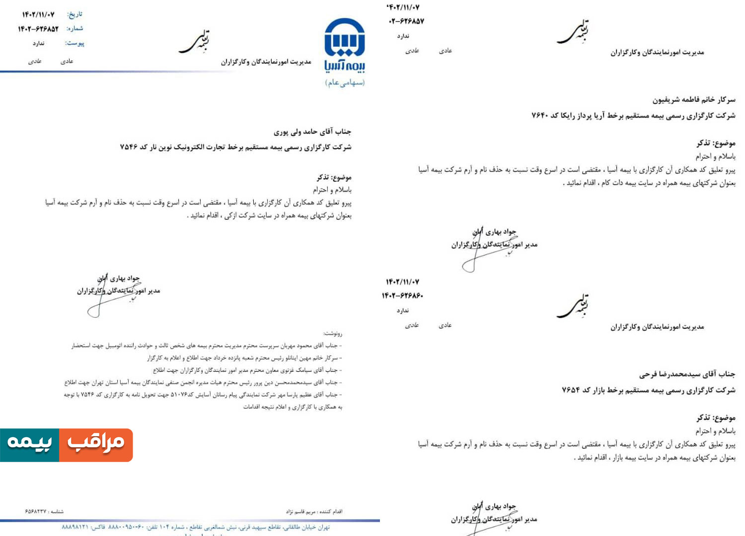 \r\nبه گزارش مراقب بیمه، با پیگیری تشکلهای صنفی بیمه آسیا در انجمن صنفی نمایندگان استان تهران و با همکاری مدیران و پشتیبان شبکه فروش در بیمه آسیا و در پی عدم توجه به تذکرات قبلی و مطابق با توافق نامه چهار شرکت بیمهای، توقف استفاده از لوگوی بیمه آسیا در سایت کارگزاران برخط بیمه آنلاین، بیمه داتکام و ازکی به ایشان ابلاغ شد.