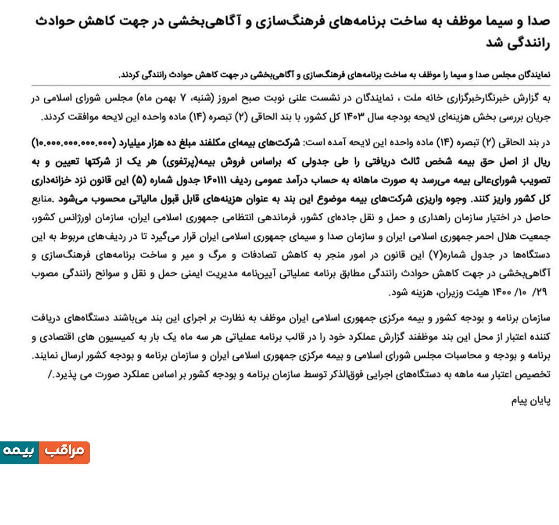 \r\nبه گزارش خانه ملت، در نشست علنی امروز مجلس شورای اسلامی و با الحاق بند 2 تبصره 14 ماده واحده لایحه بودجه 1403، سازمان صداوسیما موظف شد در راستای فرهنگسازی و آگاهیبخشی درباره خطرات مربوط به رانندگی برنامه تهیه کند.