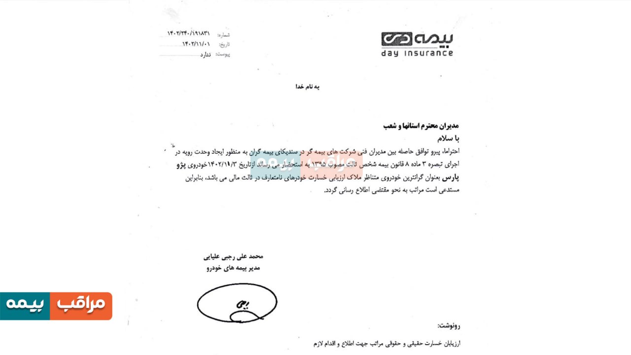\r\nبنابراین بخشنامه و از این پس، به منظور وحدت رویه در اجرای تبصره 3 ماده 8 قانون شخص ثالث مصوب 1395، از تاریخ 3 بهمنماه امسال ارزیابی خسارت شخص ثالث خودروهای نامتعارف باتوجه به درنظر گرفتن خودروی پژو پارس به عنوان گرانترین خودروی متناظر صورت میگیرد.