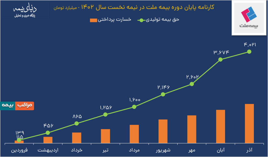 \r\nبه گزارش دنیای بیمه، درآمد بیمه ملت در آذرماه سال ۱۴۰۲ با رشدی ۲۷ درصدی و ثبت تراز مثبت ۳۶ درصد نسبت به مدت مشابه سال گذشته به رقم ۳ هزار و ۴۶۶ میلیارد و ۹۶۸ میلیون ریال رسیده و این شرکت بیمهگر در همین مدت بالغبر ۲ هزار و ۵۵۳ میلیارد و ۳۹۱ میلیون ریال خسارت پرداخت کرده است.