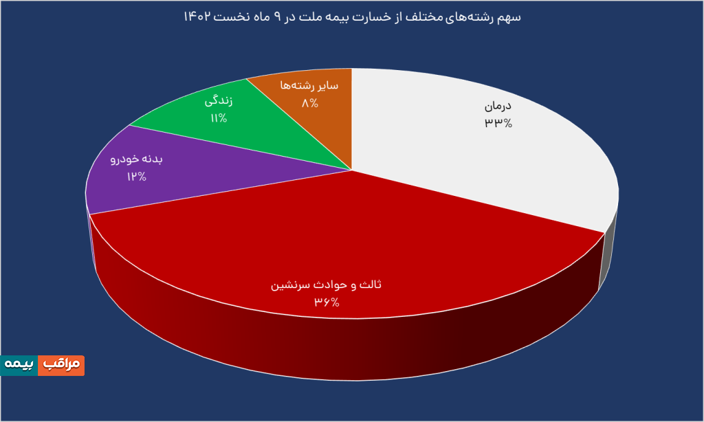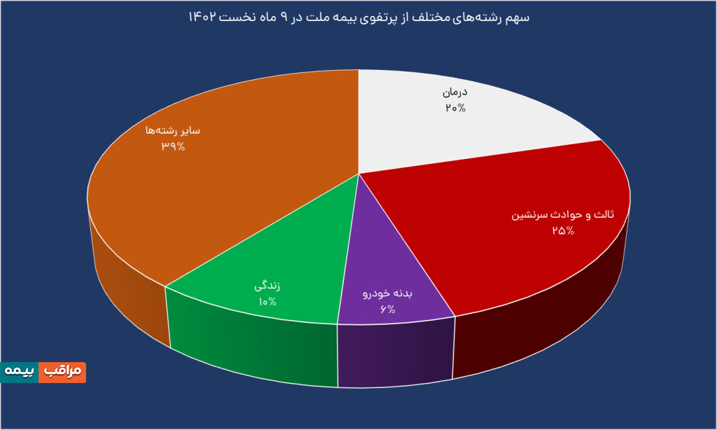 \r\nاز کل فروش بیمه ملت در ۹ ماهه نخست سال جاری ۲۰ درصد سهم رشته درمان، ۲۵ درصد سهم شخص ثالث و حوادث سرنشین، ۶ درصد بدنه خودرو، ۱۰ درصد زندگی و البته ۳۹ درصد سایر رشتهها بوده است. بهگونهای که سهم رشتههایی چون آتشسوزی ۹ درصد، نفت و انرژی ۸ درصد، کشتی و هواپیما، ۱۳ درصد و بیمه مسئولیت ۵ درصد برآورد شده است. البته یک عامل بسیار تعیینکننده در خصوص ترکیب فروش بیمه ملت، ناشی از اتکای دیگر بیمهگران بهویژه در پروژههای کلان بهواسطه سرمایه بالا و صدرنشینی بیمه ملت در شاخص توانگری مالی است.