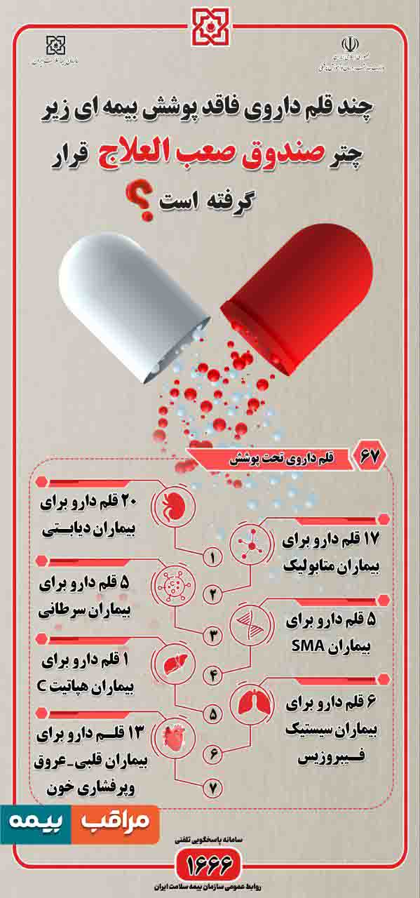 \r\nمدیرکل دفتر خدمات تخصصی سازمان بیمه سلامت ایران، در پاسخ به این پرسش که چند قلم داروی فاقد پوشش بیمهای زیر چتر صندوق صعبالعلاج قرار گرفته است افزود: «67 قلم داروی فاقد پوشش بیمهای شامل 20 قلم دارو برای بیماران دیابتی، 17 قلم دارو برای بیماران متابولیک، 13 قلم دارو برای بیماران قلبی- عروقی و پرفشاری خون، ۶ قلم دارو برای بیماران سیستیک فیبروزیس، ۵ قلم دارو برای بیماران اس ام ای، ۵ قلم دارو برای بیماران سرطانی و یکقلم دارو برای بیماران مبتلابه هپاتیت c تحت پوشش صندوق صعبالعلاج قرار گرفته است.»