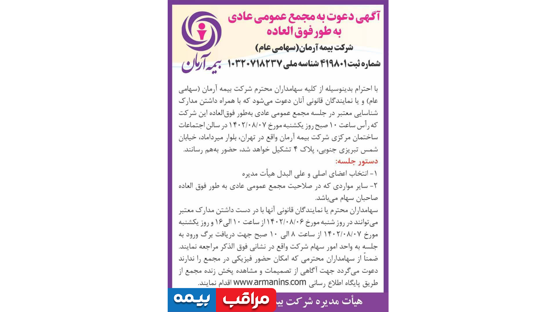 \r\nسهامداران محترم یا نمایندگان قانونی آنها با در دست داشتن مدارک معتبر میتوانند در روز شنبه مورخ 1402/08/06 از ساعت 10 الی16 و روز یکشنبه مورخ 1402/08/07 از ساعت 8 الی 10 صبح جهت دریافت برگ ورود به جلسه به واحد امور سهام شرکت واقع در نشانی فوق الذکر مراجعه کنند. ضمناً از سهامداران محترمی که امکان حضور فیزیکی در مجمع را ندارند دعوت میگردد جهت آگاهی از تصمیمات و مشاهده پخش زنده مجمع از طریق پایگاه اطلاع رسانی www.armanins.com اقدام کنند.»