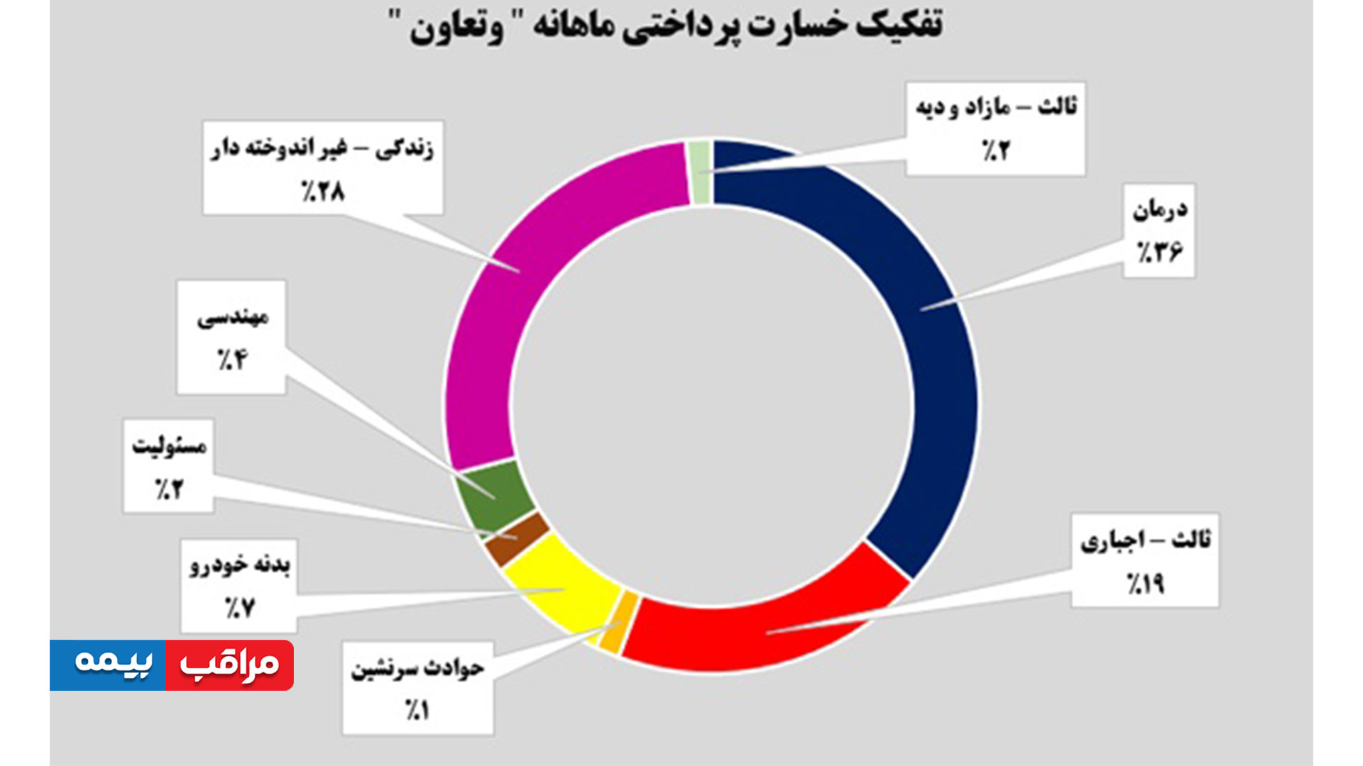 \r\n", "is_title": false, "is_link": false, "news": 878 }, { "id": 2772, "image_file": "https://api.moraghebbime.com/media/photos/news/Untitled-3_HfGD5zt.jpg", "created_at": "2023-10-01T10:41:40.092019", "text": null, "is_title": false, "is_link": false, "news": 878 }, { "id": 2773, "image_file": "EMPTY", "created_at": "2023-10-01T10:41:40.095867", "text": "نقطه مقابل حق بیمه صادره در گزارش فعالیت ماهانه، خسارت پرداختی شرکت بیمهای است. شرکت بیمه تعاون در شهریورماه سال جاری حدود ۱۱۰ میلیارد تومان خسارت پرداخت کرده است که در مقایسه با ماه گذشته، میزان خسارت پرداختی ۳ میلیارد تومان رشد داشته است. \"وتعاون\" بیشترین خسارتی که در این دوره پرداخت کرده، مربوط به بخش «درمان» با مبلغی بالغبر ۴۰ میلیارد تومان بوده است که سهم ۳۶ درصدی از خسارت پرداختی این شرکت را به خود اختصاص داده است.