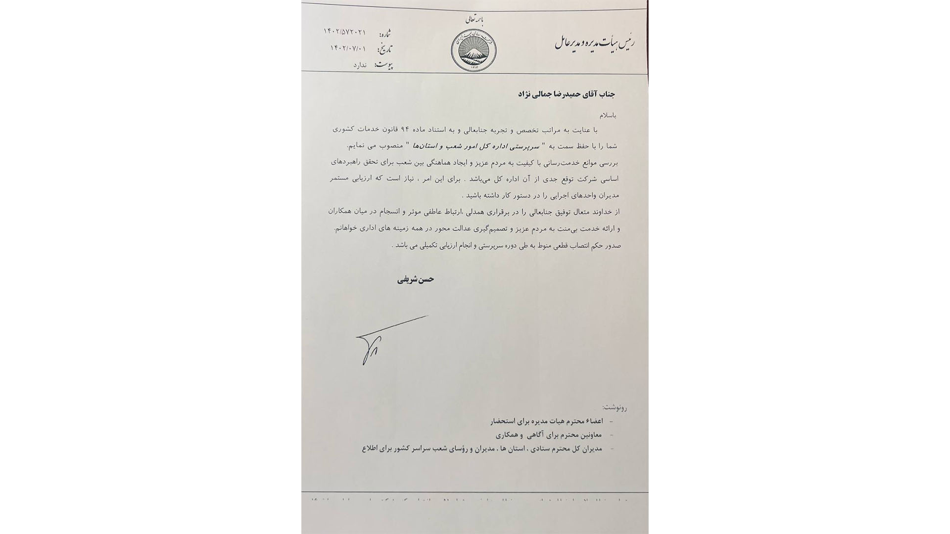 \r\nبه گزارش مراقب بیمه، در متن این حکم آمده است «بررسی موانع خدمترسانی باکیفیت به مردم عزیز و ایجاد هماهنگی بین شعب برای تحقق راهبردهای اساسی شرکت توقع جدی از آن اداره کل است. برای این امر، نیاز است که ارزیابی مستمر مدیران واحدهای اجرایی را در دستور کار داشته باشید.»