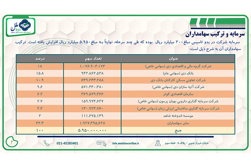 \r\n", "is_title": false, "is_link": false, "news": 227 }, { "id": 1146, "image_file": "https://api.moraghebbime.com/media/photos/news/1.jpg", "created_at": "2023-06-24T11:08:24.485133", "text": null, "is_title": false, "is_link": false, "news": 227 }, { "id": 1147, "image_file": "EMPTY", "created_at": "2023-06-24T11:08:24.491925", "text": "طبق این گزارش سرمایه بیمه دی در بدو تاسیس مبلغ 200 میلیارد ریال بوده که طی چند مرحله، نهایتا به مبلغ 5.950 میلیارد ریال افزایش یافته است. در ترکیب سهامداران این شرکت بیشترین سهم به شرکت گروه مالی و اقتصادی بیمه دی(سهامی خاص) معادل 18 درصد اختصاص دارد.