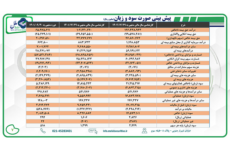 \r\nشرکت های بیمه به دلیل اعمال ذخیره برای خسارت معوق و همچنین ریسکهای منقضی شده، نوسانات زیادی را در سمت عملکرد خود تجربه میکنند که پیشبینی سود را در این شرایط دشوار میکند. براساس سهم 70 درصدی بنیاد شهید و امور ایثارگران از سبد حق بیمه صادره شرکت و همچنین افزایش حق بیمه بیش از 60 درصدی این ارگان در سال مالی 1402، سود پیشبینی شده برای این سال 2449 ریال و (P/E forward) عدد 3 برآورد میگردد. برای سال مالی 1401 نیز این نسبت عدد 5.2 پیشبینی شده که عدد مطلوبی نسبت به متوسط صنعت است.