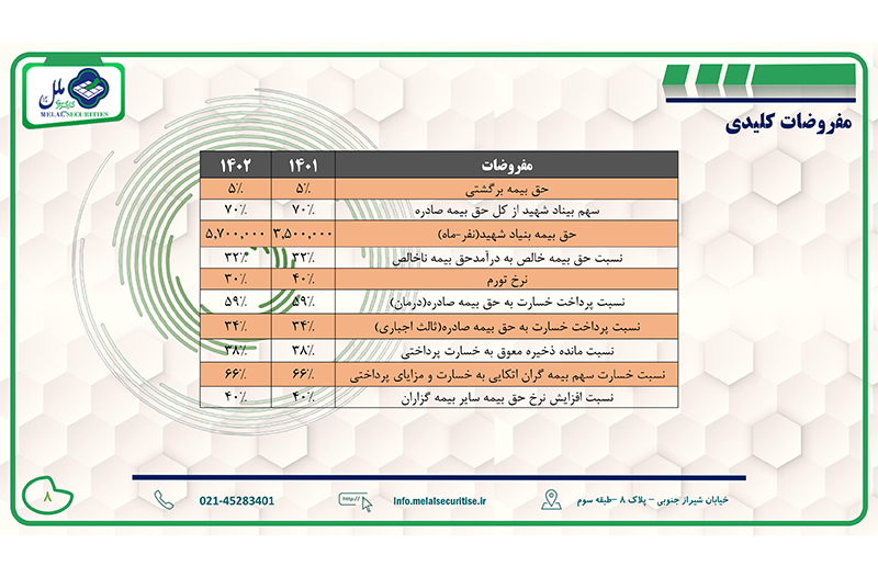 \r\n", "is_title": false, "is_link": false, "news": 227 }, { "id": 1158, "image_file": "https://api.moraghebbime.com/media/photos/news/7.jpg", "created_at": "2023-06-24T11:08:24.536716", "text": null, "is_title": false, "is_link": false, "news": 227 }, { "id": 1159, "image_file": "EMPTY", "created_at": "2023-06-24T11:08:24.541926", "text": "در بخش مفروضات کلیدی حق بیمه برگشتی در هر دو سال 1401 و 1402 چیزی حدود 5 درصد و سهم بنیاد شهید از کل حق بیمه صادره 70 درصد بوده است.