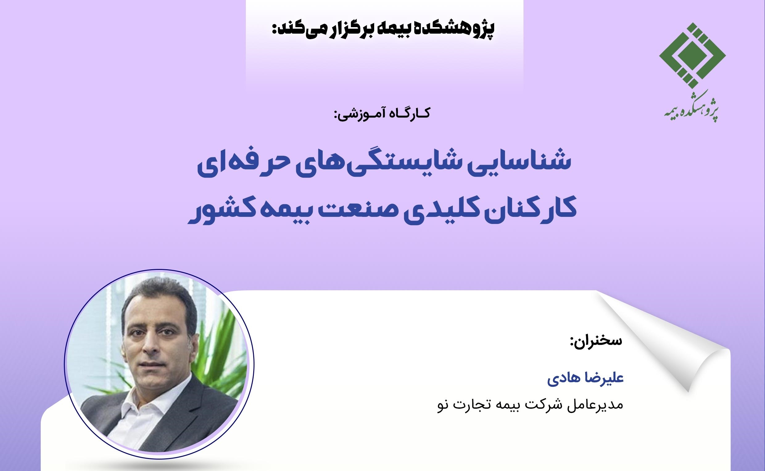\r\nبه گزارش مراقب بیمه به نقل از روابط عمومی پژوهشکده بیمه، در این نشست آموزشی محورهای «مفاهیم و کلیات شایستگی »، «معرفی مدلهای شایستگی و ارتباط آن با صلاحیت حرفه ای مدیران»، «چالش های ارزیابی و تایید صلاحیت حرفه ای مدیران کلیدی در صنعت بیمه ایران» و «الگوی پیشنهادی شایستگی های حرفه ای کارکنان کلیدی صنعت بیمه کشور» توسط علیرضا هادی، مدیرعامل شرکت بیمه تجارت نو ارائه خواهد شد.